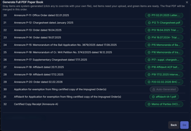 Generate a complete, ready-to-file SLP PDF with pagination, annexure labelling, bookmarking and OCR.